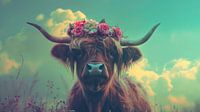 Dit unieke beeld brengt een verrassende zachtheid naar voren in een anders zo stoer en wild dier. De Hooglander, met zijn karakteristieke lange haren en grote, gebogen hoorns, kijkt rechtstreeks naar de kijker, waardoor een directe en bijna menselijke connectie ontstaat. De bloemenkrans, rijk aan kleuren en variëteit, geeft het beeld een feestelijke en bijna magische uitstraling. Tegen de achtergrond van een heldere hemel met zwevende wolken, creëert dit tafereel een contrast tussen de robuuste natuurlijkheid van de Hooglander en de delicate, vergankelijke schoonheid van de bloemen.