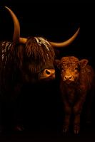 Een moeder en haar kalf staan dicht bij elkaar, hun warme roestbruine vachten bedekt met een dun laagje sneeuw. In het zachte licht komt elke vezel van hun dikke vacht tot leven, terwijl hun rustige blik en trotse houding een gevoel van bescherming en verbondenheid uitstralen. Een sereen winterportret vol kracht en…