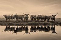 Deze sepia kunstprint toont een rij Schotse Hooglanders aan de waterkant, strak gespiegeld in het stille oppervlak. Het olieverf-effect geeft het beeld een rustige, warme uitstraling die zowel in moderne als landelijke interieurs goed tot zijn recht komt. De compositie is helder en krachtig, met een natuurlijke balans die meteen opvalt.…
