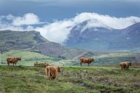 Schotse Hooglanders bij Elgol, Isle of Skye, Hooglanden, Schotland, Groot-Brittannië