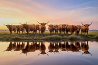 Koop dit landschapskunstwerk Schotse Hooglanders bij Zonsondergang, Olieverf van By Marjolein Design op canvas, aluminium dibond, (ingelijste) fotoprint, behang en ArtFrame, op maat geprint in Fine-Art kwaliteit.