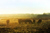 Schotse Hooglanders in de winterse zonsondergang bij het Noordlaarderbos. In het stroomdal van de Drentsche Aa.