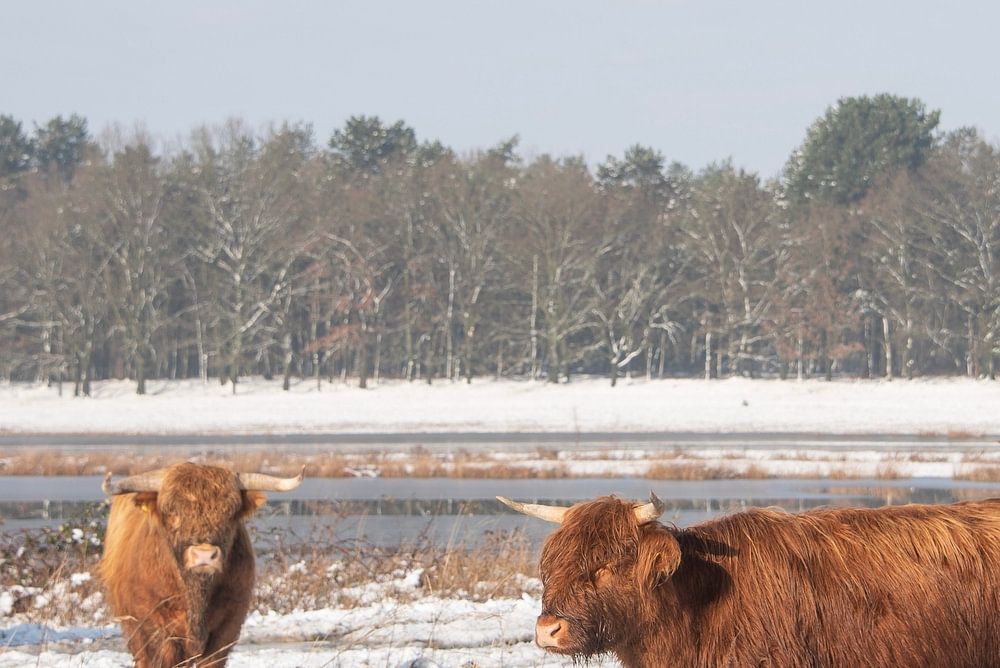 Een groepje Schotse hooglanders loopt door het met sneeuw bedekte landschap. Dit is precies de temperatuur waar ze zo van houden. Grazen lukt niet zo goed dus dan lopen ze maar wat rond en kijken ze om zich heen, precies waar ik als fotograaf zo van houd. Hun roodbruine kleur steekt mooi af tegen de witte sneeuw, dit geeft een mooi contrast bij deze prachtige grote grazers. Deze foto is gemaakt in een natuurgebied in Noord-Brabant in Nederland.