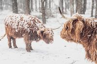 Portret van twee Schotse Hooglanders in de sneeuw tijdens de winter. De Schotse Hooglanders worden ingezet bij het natuurbeheer op de Veluwe om ervoor te zorgen dat heidegebieden niet dichtgroeien.
