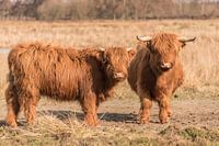 Twee Schotse Hooglanders staan lekker in de zon, in natuurgebied Huis ter Heide in De Moer in Nederland. Het gebied wordt beheerd door Natuurmonumenten.