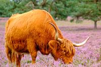 Schotse Hooglanders in een bloeiend heideveld tijdens een een zomerse dag op de Veluwe. De Hooglanders begrazen het natuurgebied zodat de heide meer kans krijgt om te groeien.