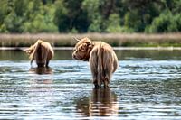 Deze Schotse Hooglanders koelen af in het water op een mooie zomer dag. Schotse Hooglanders zijn op meerdere plekken in Nederland in het semi-wild te bewonderen