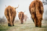 Schotse Hooglanders in ochtendmist