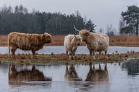 Drie Schotse Hooglanders, een volwassen rood-bruine, een volwassen blonde en een blond kalf, staan samen op een eilandje in het water in natuurgebied Huis ter Heide in Noord-Brabant in Nederland. Het gebied wordt beheerd door Natuurmonumenten.
