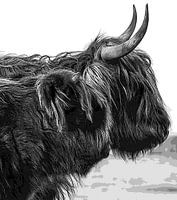 Silhouet van Schotse Hooglanders, moeder en kind, in natuurgebied Huis ter Heide in De Moer in Nederland. Het gebied wordt beheerd door Natuurmonumenten.