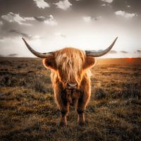 Schotse Hooglander op een wei met typische uitgesproken manen/voorhoofdmanen, mooie vacht en symmetrisch gebogen en goed uitgegroeide hoorns.