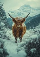 Een hooglandkoe in de besneeuwde bergen, omringd door winterbladeren en pijnbomen. De hoorns van de hooglandkoe glinsteren onder de bewolkte hemel terwijl er lichte sneeuw om haar heen valt. De scène legt hun majestueuze aanwezigheid vast te midden van de schoonheid van de natuur.