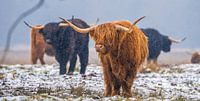 In de winter verandert de Drentse heide in een verstild, bijna sprookjesachtig landschap. Een dunne laag rijp of sneeuw bedekt de paarse heide, terwijl de wind vrij spel heeft over de open vlakte. Tussen deze koele tinten vormen de ruige, roodbruine vachten van de Schotse hooglanders een warm contrast.