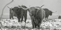 In de winter verandert de Drentse heide in een verstild, bijna sprookjesachtig landschap. Een dunne laag rijp of sneeuw bedekt de paarse heide, terwijl de wind vrij spel heeft over de open vlakte. Tussen deze koele tinten vormen de ruige, roodbruine vachten van de Schotse hooglanders een warm contrast.