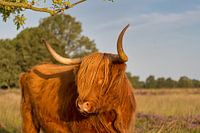 Schotse hooglander op de heide in Drenthe. Dit oerrund staat stoer om zich heen te kijken