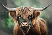 ai beeld van een portret van een schotse hooglander. Met waterverf achtergrond. De foto heeft een groen bruin beeld. De koe is van voren zichtbaar.