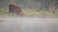 Schotse hooglander drinkt in alle vroegte uit een meer. Er hangt een dun laagje nevel boven het water.