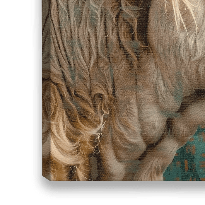 Een schotse hooglander en een roodharige vrouw dicht bij elkaar. Mixed media kunstwerk met een blauwgroene achtergrond.