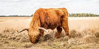 Schotse hooglander grazend van hoog gras in een natuurpark van Natuurmonumenten op de Veluwe. Liggende foto in kleur.