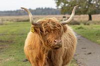 Foto van een schotse hooglander hoofd portret. De koe kijkt schuin in de camera. De foto is gemaakt op 1 november 2023, op het Hijkerveld, Drenthe.