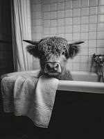 Dit bijzondere kunstwerk brengt direct een glimlach op je gezicht. In een klassieke badkuip, omringd door witte tegels, staat een schotse hooglander rustig voor zich uit te kijken. Het dier leunt over de rand, waar een handdoek netjes hangt alsof het een dagelijkse routine is. De combinatie van de zachte vacht en de stoere horens contrasteert prachtig met de strakke lijnen van de badkamer. De zwart-wit weergave geeft het beeld een tijdloze, bijna filmische uitstraling, terwijl het onderwerp juist speels en verrassend is. Het is een moment dat balans vindt tussen humor en schoonheid. Alsof de hooglander even pauze neemt van het buitenleven om te genieten van een onverwachte luxe. Het spel tussen het alledaagse interieur en het ongewone dier geeft dit werk zijn unieke charme. Deze foto is niet alleen grappig, maar ook stijlvol en artistiek. Perfect voor wie houdt van kunst met een knipoog en een vleugje absurditeit.