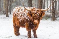 Portret van een Schotse hooglander in de sneeuw tijdens de winter. De Schotse Hooglanders worden gebruikt in het natuurbehoud van de Veluwe om ervoor te zorgen dat de heidegebieden niet dicht opeen groeien.