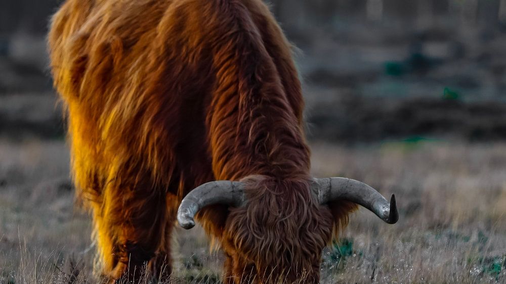 Schotse hooglander bij Deelerwoud, Gelderland tijdens een wandeling in het bos. Er zijn veel soorten schotse hooglander in de regio.