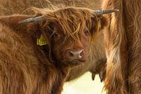 In de Biesbosch loopt een grote kudde Schotse hooglanders op een plek die alleen per bootje bereikbaar is. In deze kudde waren heel veel jonge kalfjes, Dit is er een van die heel schattig mijn kant op keek