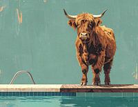 Een schotse hooglander zoekt verkoeling bij een zwembad. Stoere hooglander met roodbruine vacht en robuuste lange hoorns. Digitaal kunstwerk gemaakt met hulp van AI.