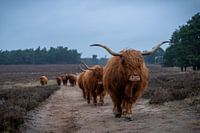 Schotse hooglander kudde met kalveren op weg naar nieuw gras op de Wezeper heide.