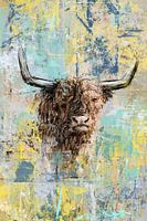 Schotse hooglander kunstwerk in bruin geel mint blauw en grijs van Emiel de Lange