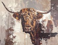 Uit serie van vier. Een kunstwerk van een schotse hooglander. In aarde tinten, roestbruin beige taupe en oranje. Stoer en landelijk kunstwerk in semi abstracte expressieve stijl.