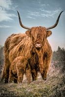 Foto van een stoere schotse hooglander koe met een drinkend kalfje