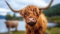 Fotorealistisch digital artwork van een nieuwsgierige schotse hooglander. Kunstwerk in olieverf stijl, gemaakt met digitale technieken.