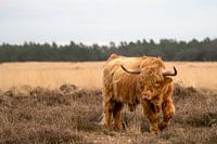 Natuurgebied het Deelerwoud op de Veluwe in Nederland. Stoer en indringend portret van de robuuste Schotse Hooglanders die in het Deelerwoud de heidevelden begrazen.