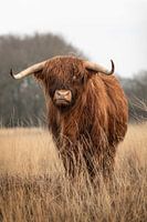 Frontale foto van een jonge Schotse hooglander stier. Met de kop omhoog kijkt het dier in de lens. Hij staat in het hoge gras en de heide van het Scharreveld in Drenthe. De foto is genomen in januari 2022, Drenthe, Nederland.