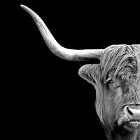 Deze prachtige Schotse hooglanders zijn uit hun natuurlijk omgeving geselecteerd en op een zwarte achtergrond geplaatst. Ook is de foto omgezet naar zwartwit hierdoor krijgt de foto meer zeggingskracht. Deze Highlander cows zijn zo populair omdat de dieren schitterende haren en horens hebben. En meestal kijken ze stoer en uitdagend in de lens.