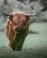 Prachtig portret van een jonge schotse hooglander stier. Door de manier van lopen en de kleuren, lijkt het alsof het stiertje op je af wil lopen.