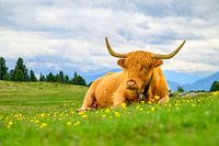 Schotse hooglander rust uit op een bergweide bij de Peitlerkofel of Sass de Putia berg in de Dolomieten in Zuid-Tirol, Italië tijdens de lente.