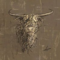 Tekening met houtskool op papier ingekleurd met photoshop in bruin taupe geel en zwart. Landelijk kunstwerk van een schotse hooglander kop. Dit kunstwerk heeft een vierkant formaat.