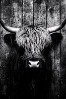 Deze prachtige zwart-witfoto van een Schotse hooglander straalt kracht en rust uit. De indrukwekkende hoorns en de zachte, warrige vacht worden prachtig vastgelegd tegen een rustieke houten achtergrond. Dit kunstwerk voegt een vleugje elegantie en natuur toe aan elke ruimte, of het nu een woonkamer, slaapkamer of hal betreft. Perfect voor liefhebbers van dieren, monochrome kunst en minimalistisch design. Dit stuk past moeiteloos in zowel moderne als klassieke interieurs en brengt een gevoel van verbondenheid met de natuur naar binnen.