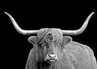 Deze prachtige Schotse hooglanders zijn uit hun natuurlijk omgeving geselecteerd en op een zwarte achtergrond geplaatst. Ook is de foto omgezet naar zwartwit hierdoor krijgt de foto meer zeggingskracht. Deze Highlander cows zijn zo populair omdat de dieren schitterende haren en horens hebben. En meestal kijken ze stoer en uitdagend in de lens.