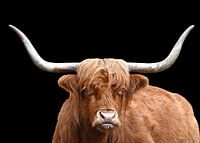 Deze prachtige Schotse hooglanders zijn uit hun natuurlijk omgeving geselecteerd en op een zwarte achtergrond geplaatst. De foto omgezet naar zwartwit hierdoor krijgt de foto meer zeggingskracht. Deze Highlander cows zijn zo populair omdat de dieren schitterende haren en horens hebben. En meestal kijken ze stoer en uitdagend in de lens.