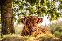 Prachtige roodbruine schotse hooglanders in absolute rust modus in een natuurgebied in Brabant.