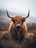 Deze indrukwekkende voorstelling van een Schotse hooglander vangt de stoere uitstraling en natuurlijke kracht van dit majestueuze dier. De gedetailleerde weergave van de lange horens en de ruige vacht, gecombineerd met een zachte achtergrond, benadrukt de verbondenheid met de natuur en de wilde landschappen waar de hooglander thuis hoort.