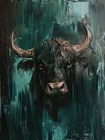 Dit schilderij toont een krachtig en indrukwekkend beeld van een Schotse hooglander, vastgelegd in een expressieve en abstracte stijl. Het gezicht van de stier is het centrale punt van het werk, met een intense blik die de toeschouwer direct aankijkt. De hoorns van het dier steken sterk naar buiten en vormen een bijna symmetrisch…