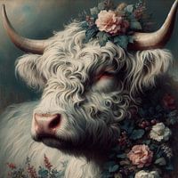 Een digitaal kunstwerk van de geliefde Schotse Hooglander in de stijl van een klassiek schilderij. Het dier heeft een witte vacht en is omringd met bloemen voor een sprookjesachtig accent in je interieur.