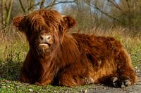 Dit Schotse Hooglander kalf neemt liggend een heerlijk zonnebad.