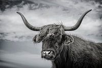Veel mensen willen graag een foto van een schotse hooglander aan de muur. Wat denk je van deze stoere zwart-wit uitvoering?