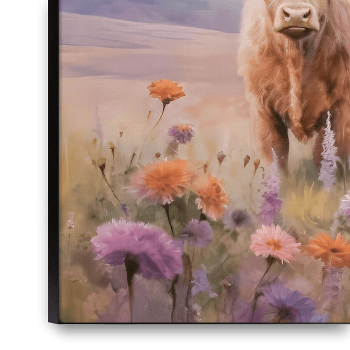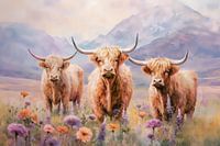 Schotse hooglanders in pastelkleuren, in een omgeving van bloemen en bergen.